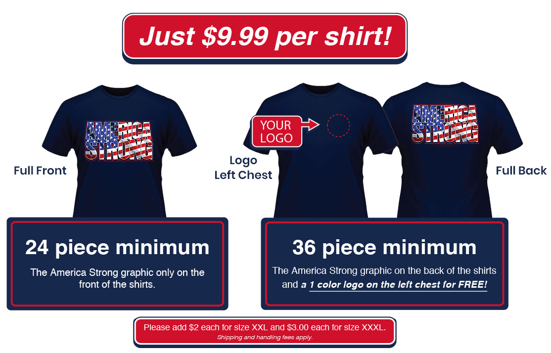 OPTION 1: You can order the shirts with the America Strong graphic on the front only with a low 24 shirt minimum.